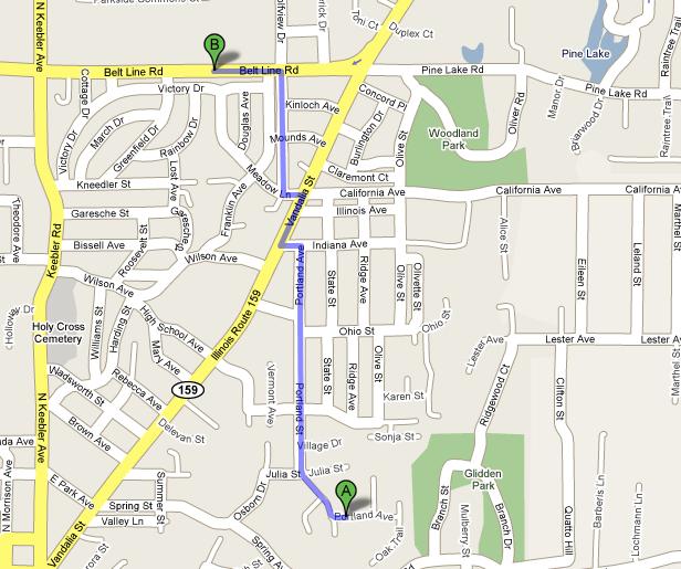 If I were to ride to the grocery store, this would be my route . . . 1.2 miles [1.93 km]